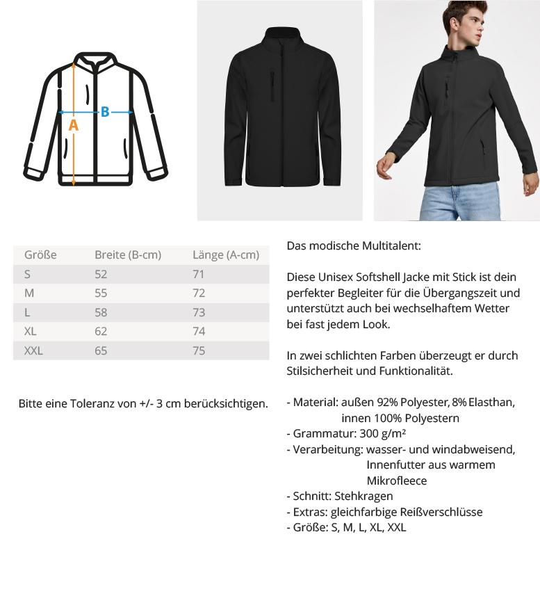 - Unisex Sofshell Jacket. Perfekt für wechselhaftes Wetter in der Übergangszeit – ein treuer und bequemer Wegbegleiter. Unisex Softshell Jacket mit Stick